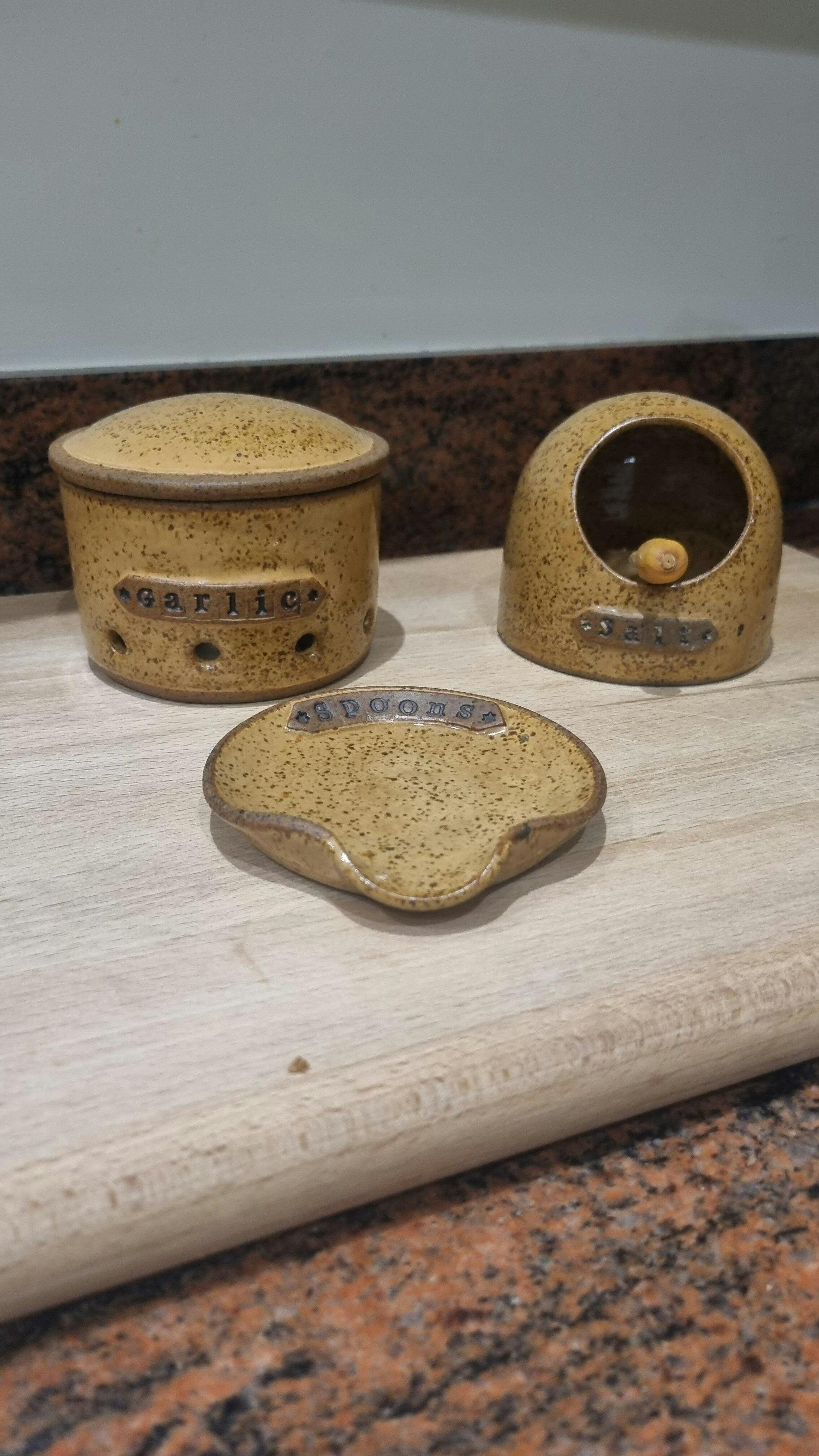 This salt pot with spoon makes a delightful pottery gift for any foodie or lover of unique kitchenware. Explore the rest of my kitchenware range for more complementary pieces - it's often bought with a utensil holder or oil bottle. It will arrive safely packaged in recyclable paper and card. Happy seasoning!